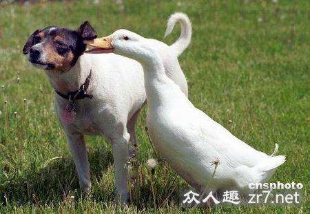 在美国俄亥俄州一个农场里,一只名叫苏茜的鸭子正在帮她的“好友”小狗搔痒,这些家养动物朝夕相伴,和谐相处生趣无穷。